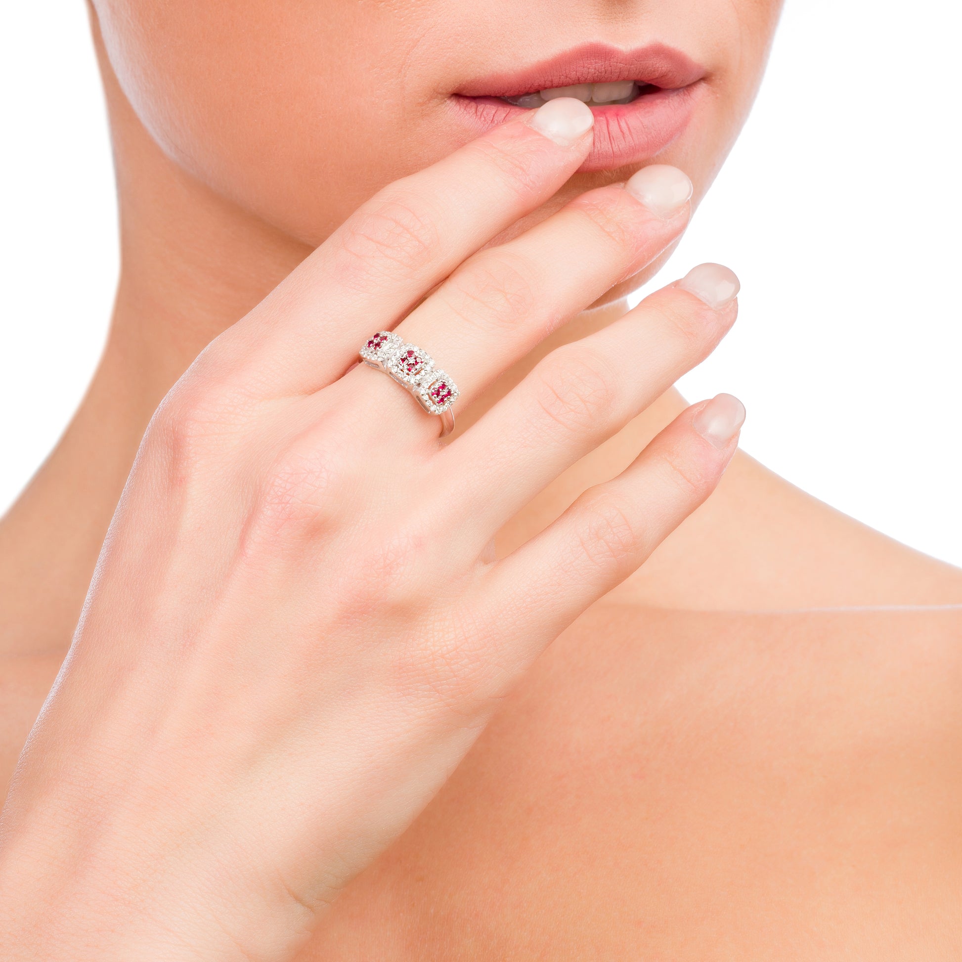 Trilogy in oro bianco 18kt con rubini e diamanti naturali. Gioiello di raffinata fattura artigianale, perfetto per ogni occasione con eleganza senza tempo.