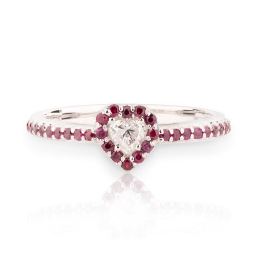 Anello in oro bianco, diamante taglio cuore e rubini taglio brillante
