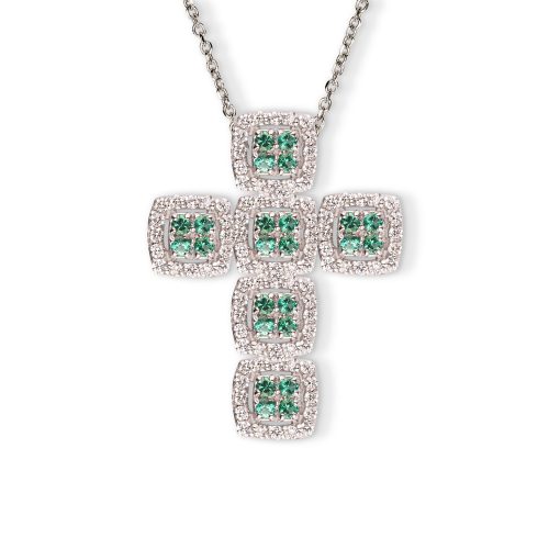 Croce in oro bianco incastri forma quadrata, smeraldi e diamanti taglio brillante