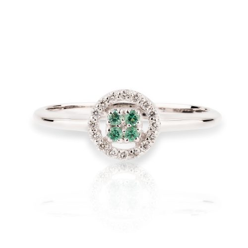 Anello in oro bianco forma circolare, smeraldi e diamanti taglio brillante