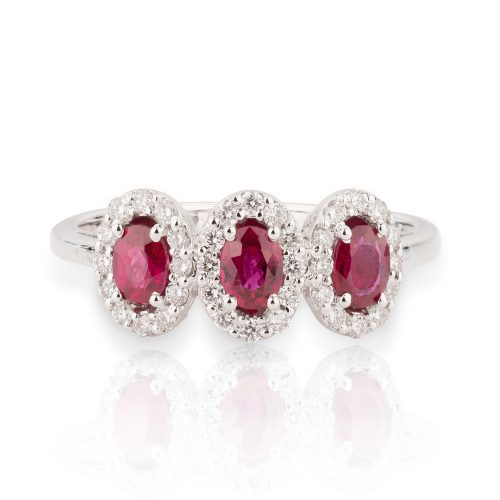 Anello trilogy in oro bianco, rubini taglio ovale e diamanti taglio brillante