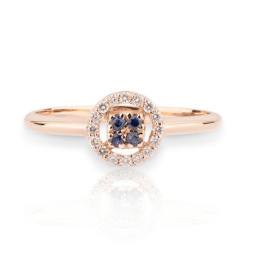 Anello in oro rosè forma circolare, zaffiri e diamanti taglio brillante