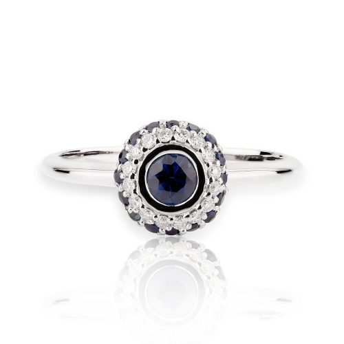 Anello in oro bianco forma circolare con zaffiri e diamanti taglio brillante