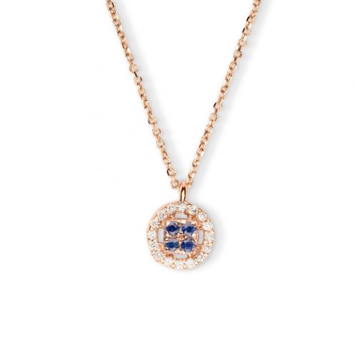 Collana in oro rosè forma circolare, zaffiri e diamanti taglio brillante
