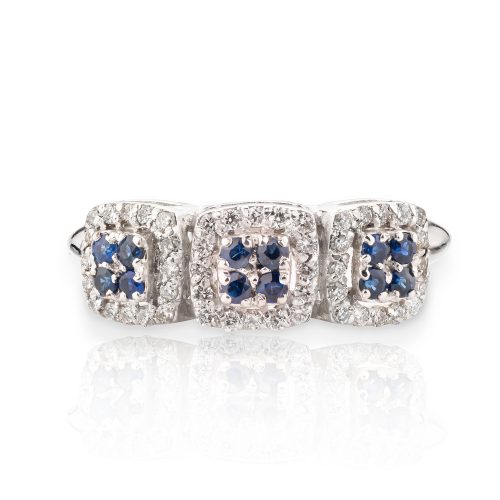 Anello trilogy in oro bianco forma quadrata, zaffiri e diamanti taglio brillante