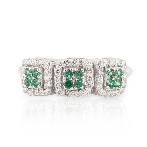 Anello trilogy in oro bianco forma quadrata con smeraldi e diamanti taglio brillante
